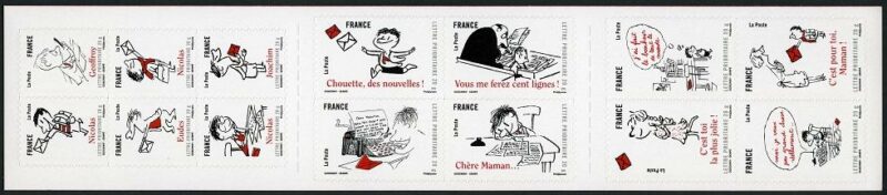 Ils sont dessinés par Jean-Jacques Sempé, décédé cet été à l’âge de 89 ans. Né à Pessac (Nouvelle-Aquitaine) il a connu une enfance difficile ce qui ne l’a pas empêché une fois adulte de devenir un grand poète, sensible, tendre, montrant au travers de ses dessins le bon côté de la vie, toujours avec un humour décalé et attendrissant. Son personnage le plus connu que l’on aperçoit sur les timbres (hormis celui dédié à l’anniversaire) est le Petit Nicolas.