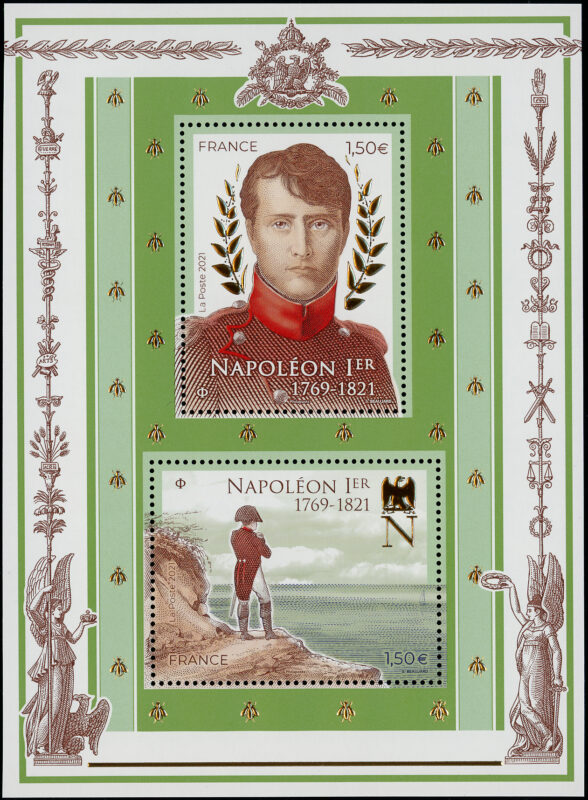 Dessiné et gravé par Sophie Beaujard – Timbre Portrait de Napoléon d’après photo (c) akg-images/Timbre Napoléon d’après photo (c) RMN-Grand Palais (musée des châteaux de Malmaison et de Bois-Préau/Yann Martin- Fond de bloc : Livre du sacre de S.M. l’empereur Napoléon dans l’église métropolitaine de Paris le XI Frimaire an XIII, dimanche 2 décembre 1804 [dessinateurs : Isabey, Percier, Fontaine ; graveurs : Dequevauvillers … et al.]